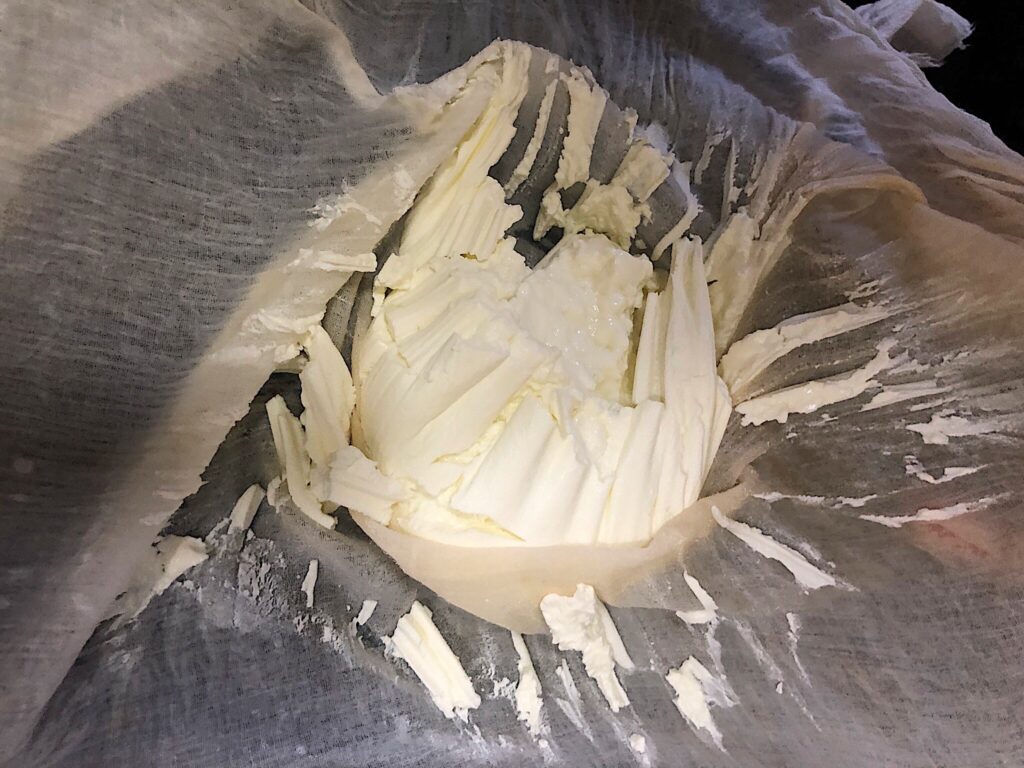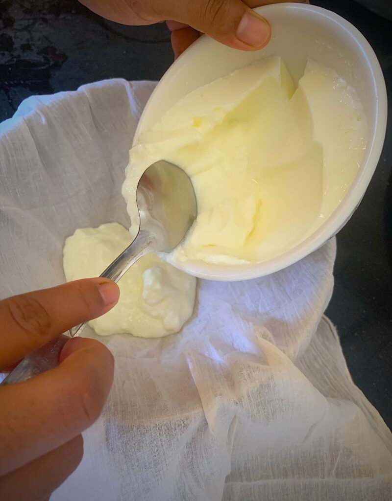 4. Remove the strained yoghurt from the cloth and put it into a mixing bowl.