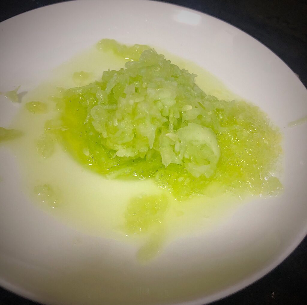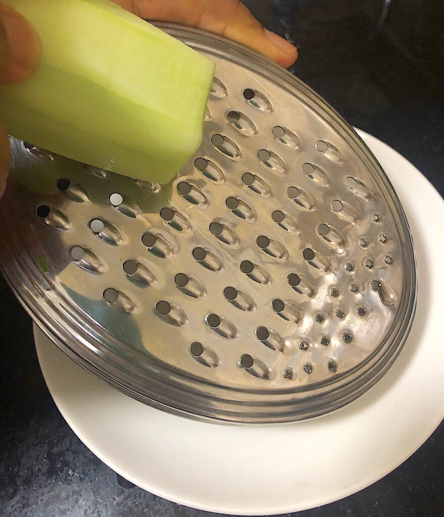 3. Peel the cucumber and grate it. Add a pinch of salt and leave it on the grater for 30 minutes to drain out the excess water from the cucumber.