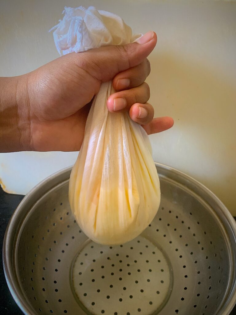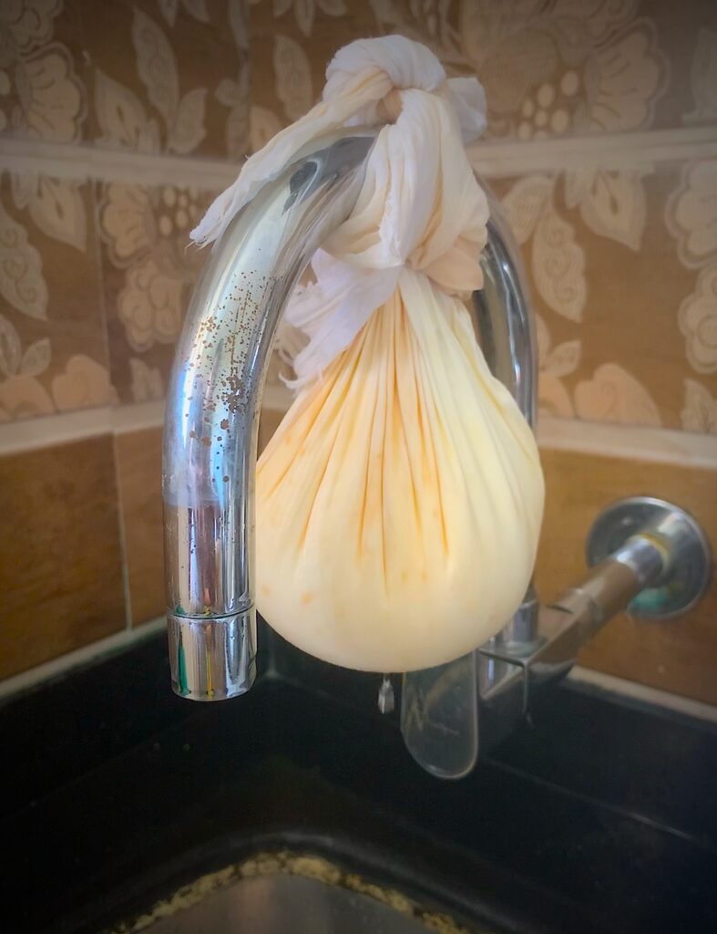 2. Spread a muslin cloth (handkerchief size) on a colander or wide bowl. Empty the bowl of yoghurt onto the centre of the cloth. Pick up the four edges of the cloth, twist and tie a knot, and then leave it hanging from the tap over the sink for 2-3 hours. Skip this step if you have bought Greek yoghurt instead of the regular one.